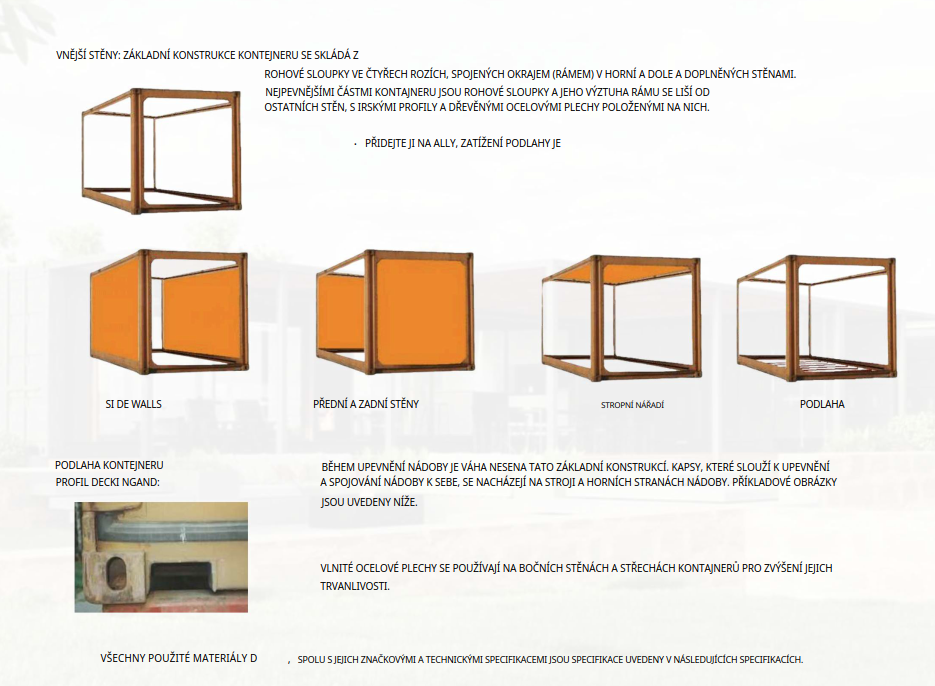 Na boční stěny a střechu kontejneru jsou použity vlnité ocelové plechy, které zvyšují mechanickou odolnost konstrukce.